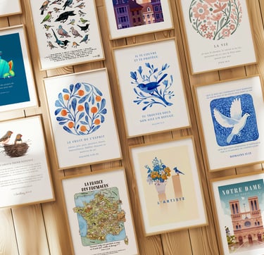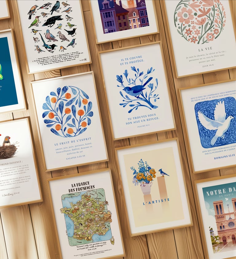 Mon offre d’affiches et cartes tourne principalement autour de domaines qui ont de la valeur pour moi : l’éducation, la valorisation du patrimoine français, et la spiritualité chrétienne.